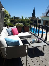 Kitchen is fully equipped, ceiling-high cabinets in walnut, granite counter tops and beautiful ceramic tiles. Small coffee table. Exit to the barbecue area.