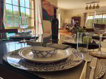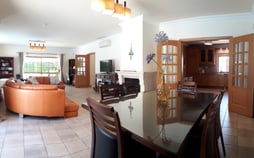 Dining room, in open plan with the living room, has dining table for 8 persons and a sideboard.